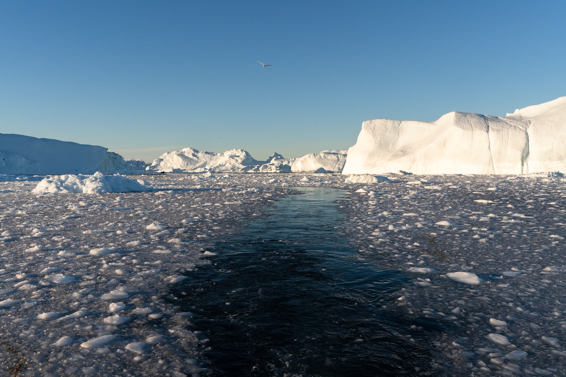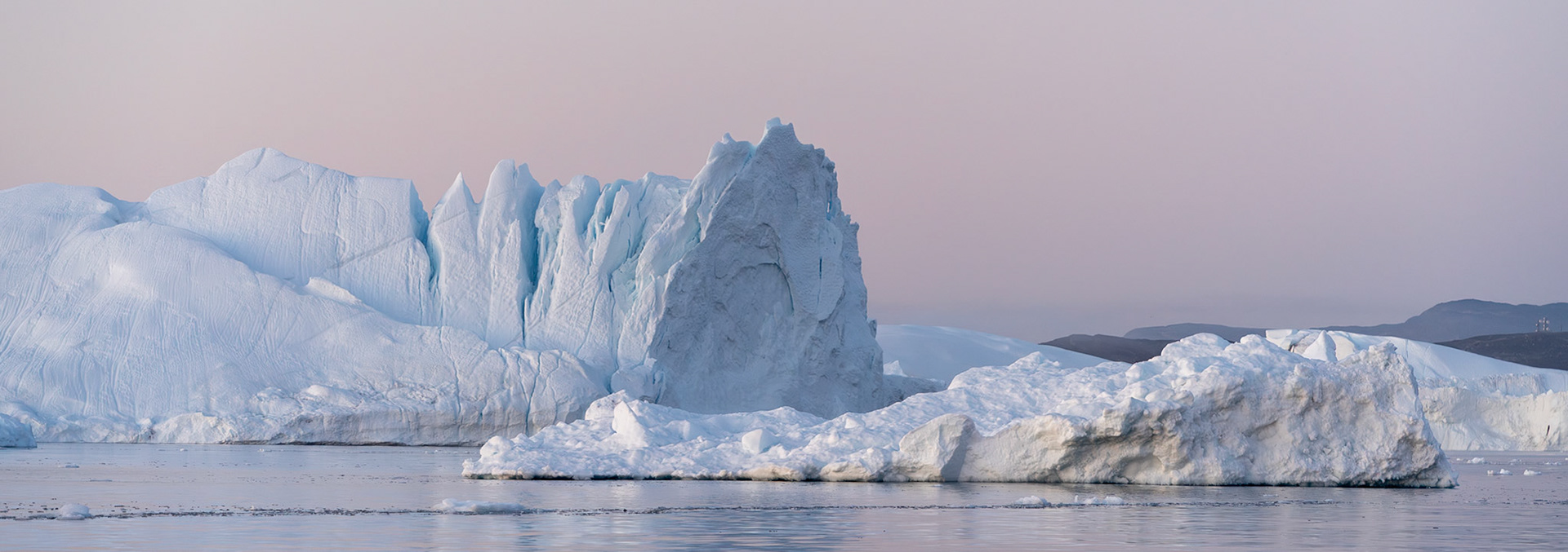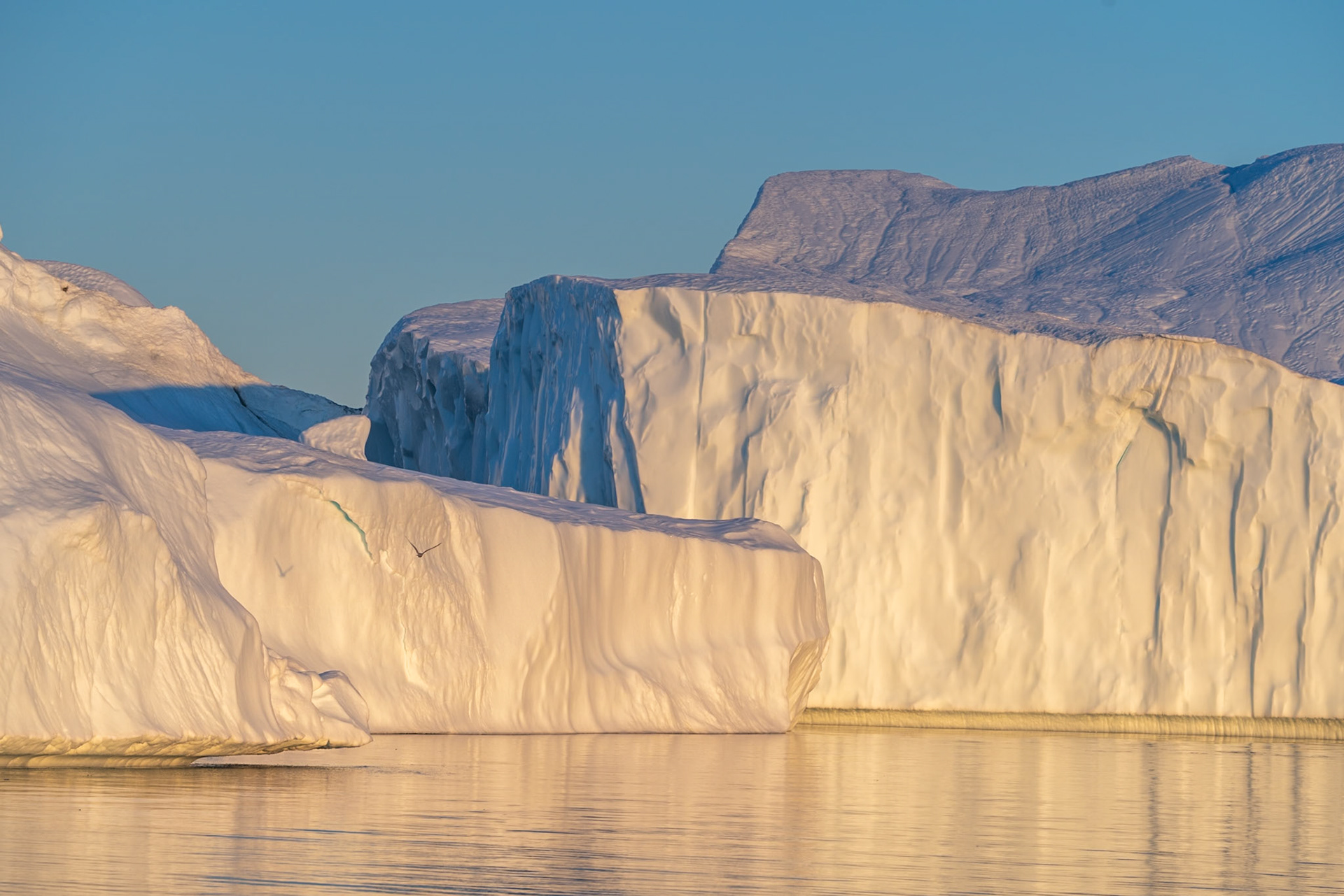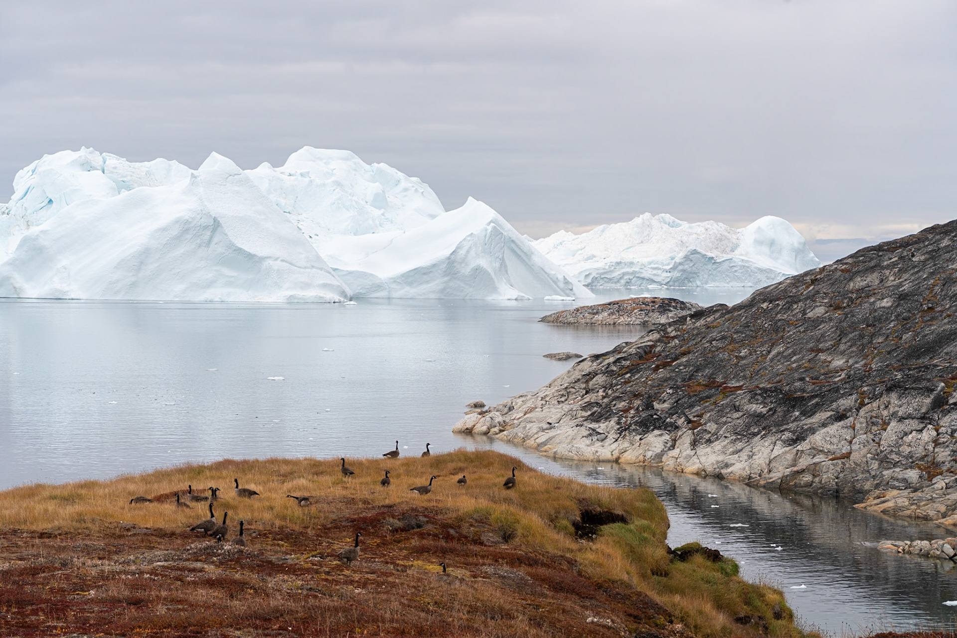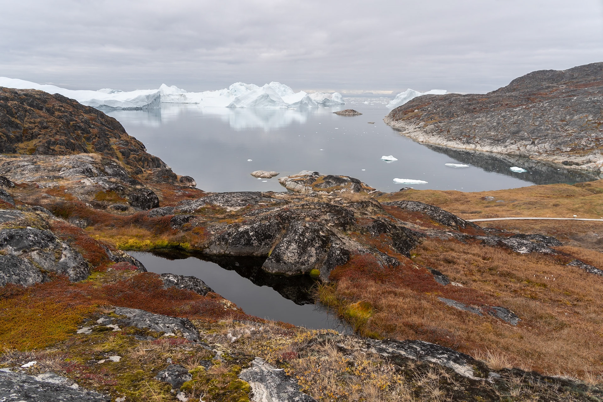 South of Ilulissat is an ice fjord from which countless icebergs drift northwards. There are three hiking trails around the town of Ilulissat from which you can see the ice fjord and icebergs from a distance.